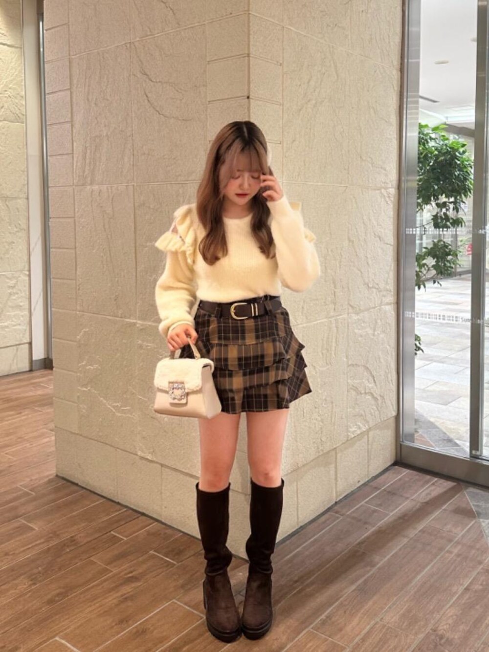 スカートとロングブーツで秋っぽさがあり、ニットでガーリー感を作りました。ニットは毛玉が出来にくいので何回着ても可愛さが保たれます。