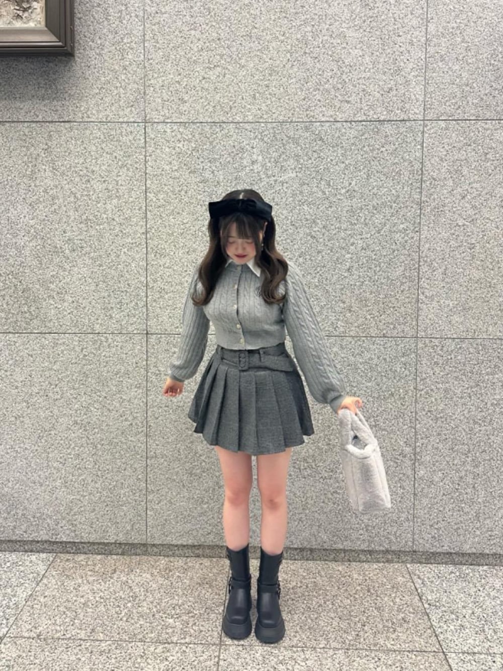 セーターのようなグレーのトップスにリボンカチューシャでフレンチガーリー🎀🩶コートはなに合わせてもかわいいです💞