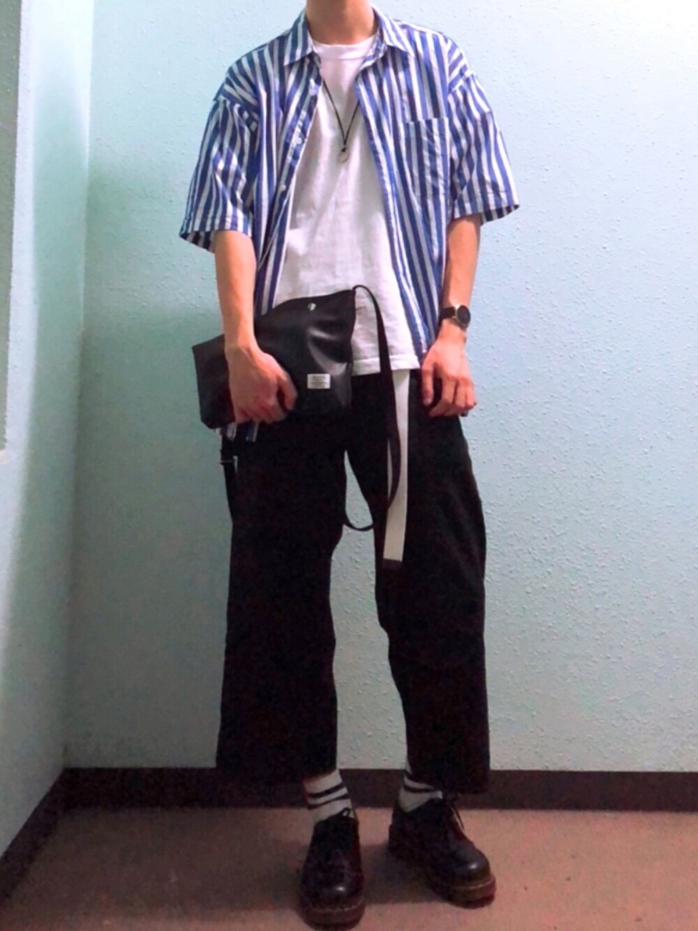 サコッシュを何故かクラッチバッグ風に持ってしまった(笑) これはこれでいいんじゃね?ってなってる 【シャツ】L 【インナー】L 【パンツ】S 【シューズ】25