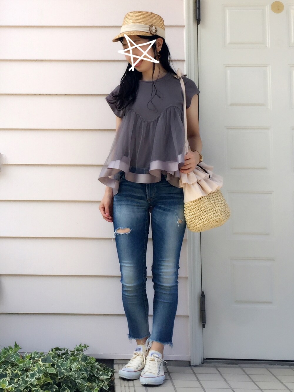 kcoのTシャツ/カットソー「なみなみギャザーチュール立体シルエットヘムグログランリボンテープフレンチスリーブ変形フレアTシャツカットソー」を使ったコーディネート
