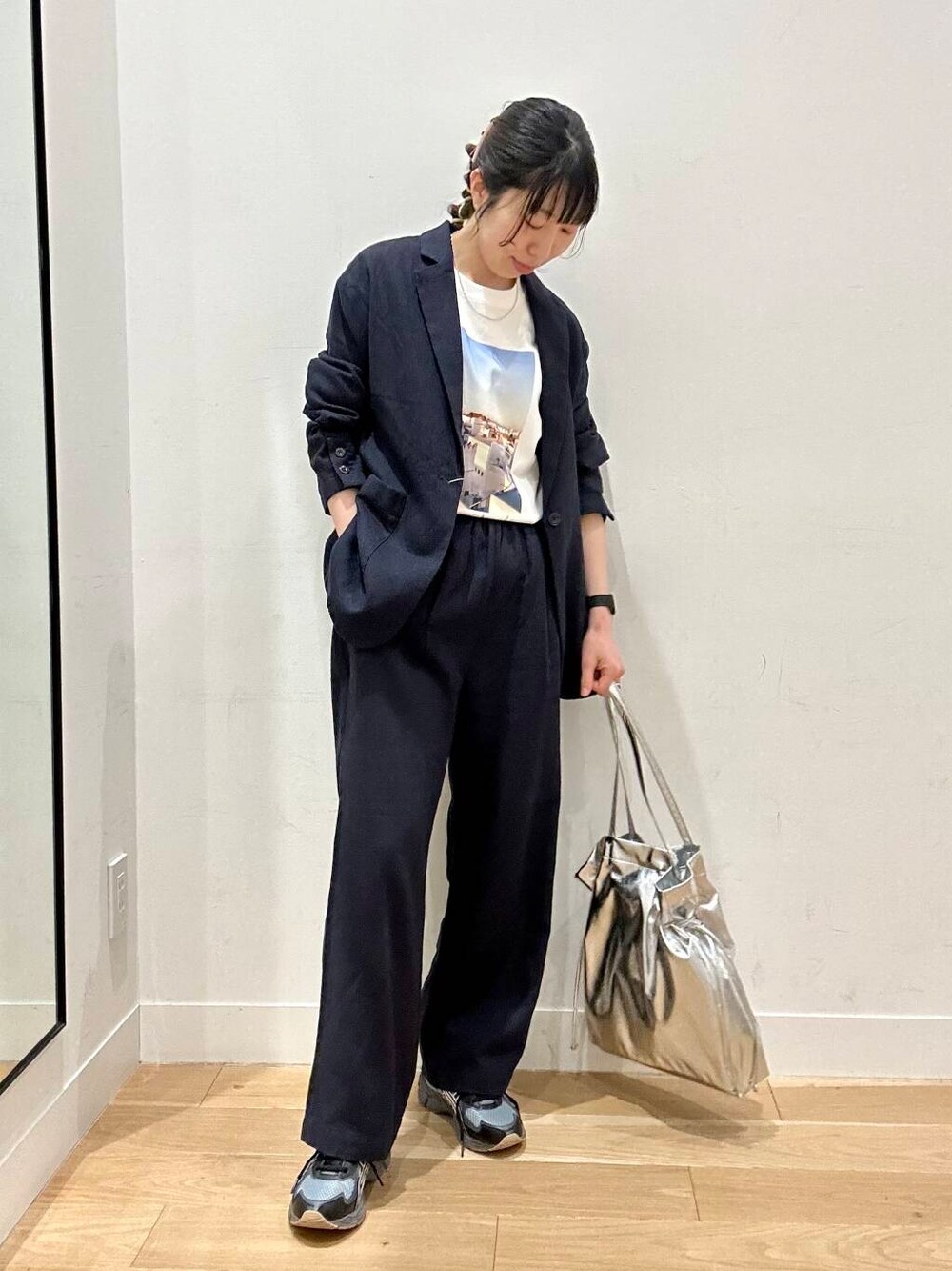 FORK&SPOONのジャケットとパンツをセットアップで着ました! キチンと感もありつつ、柔らかく風合いのある生地なのでカジュアルに着ていただけます🙆♀️ 私はフォトTEEやスニーカー、メタリックなバッグをプラスして、よりアクティブな感じにしてみました😉 セットアップってなんか特別感あってワクワクしますよね✨
