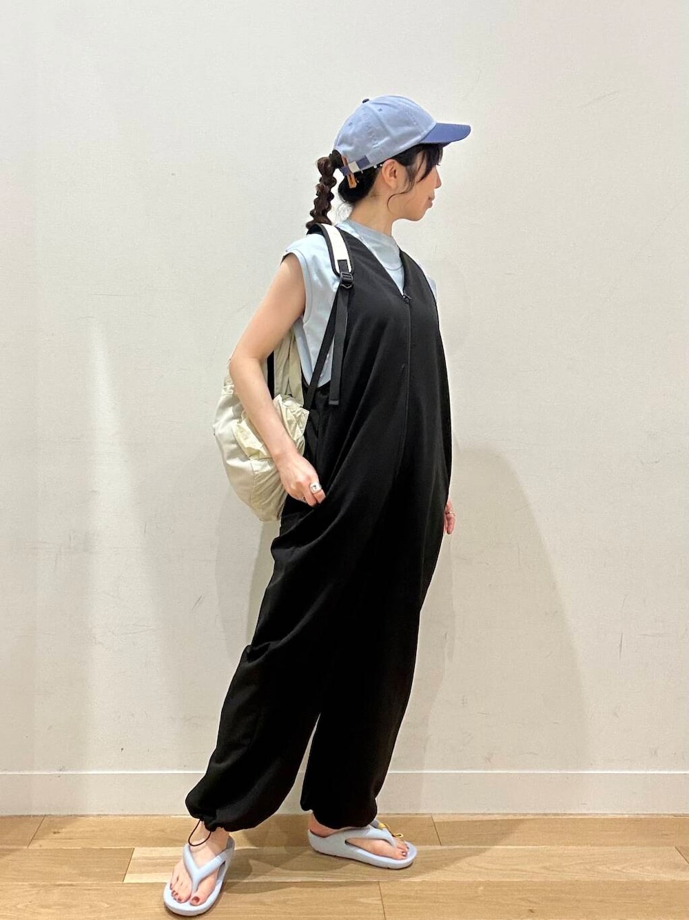 黒のオールインワンに、水色のアイテムでまとめました🩵 インナーのカットソーは、ドライタッチでサラッとした着心地。 シンプルなデザインなので着回しもききそうです! オールインワンはフロントのジップを少し開けて、襟を内側に織り込んで着てみました! 裾が絞れるのが可愛いです🙆♀️ サンダル、キャップでアクティブに♪ DOORSを着ておでかけしましょ☺️