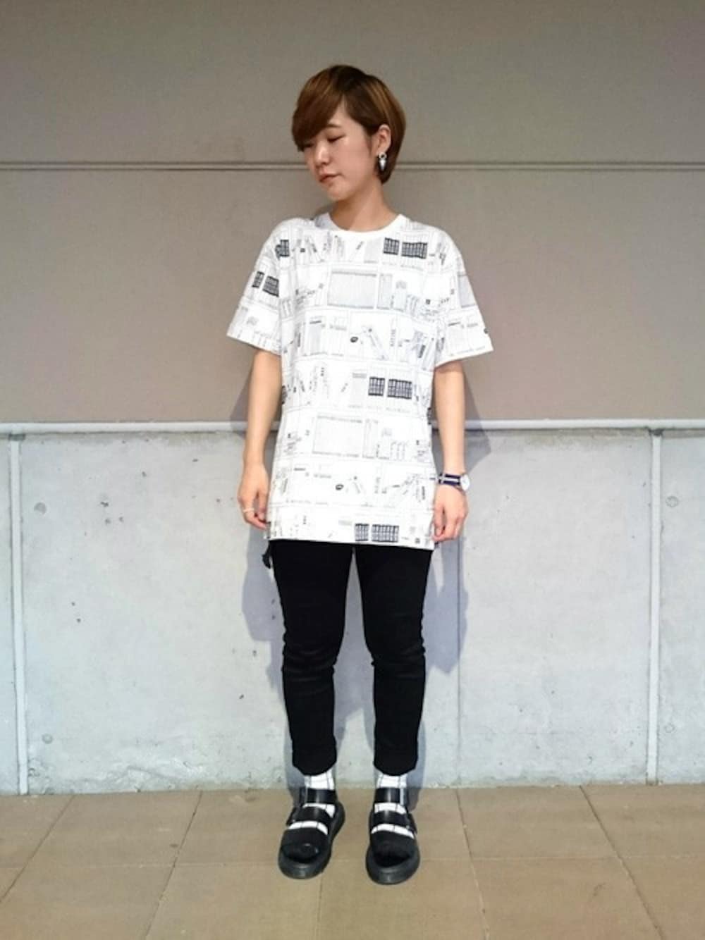 四角い枠の中にはデザインやアートに関する本が並べられています。 本棚をイメージした手書きのイラストと白黒のバランスが丁度良く、カジュアルにも少しキレイめにも使えそうな総柄Tシャツです。 総柄Tならモノトーンコーデもシンプルになりすぎないのでオススメです。 すっきりカッコイイ印象にしたかったのでレザーサンダルを合わせました。