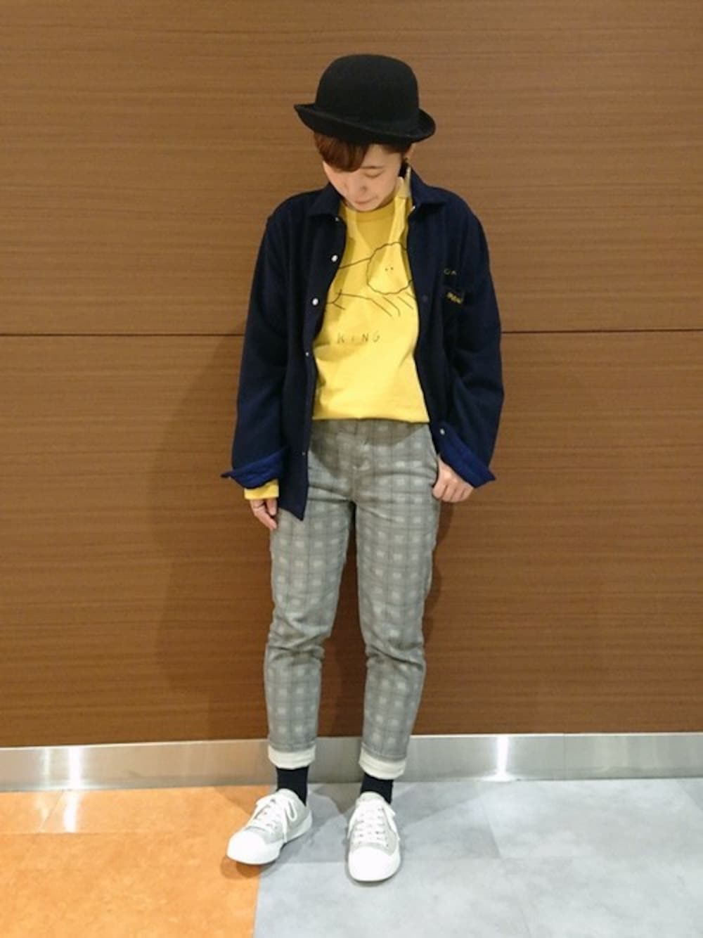 百獣の王のイメージとは程遠い、ゆるいタッチで描かれたライオンです。 その下の「KING」の手書きロゴもゆるさに拍車をかけてます。 クラシックイエローは奇抜さを感じない色味で、これからの季節の着こなしにも 使い勝手が良さそうです。 ロンTを主役に、所々にブラックやネイビーを使ってゆるさの中に少しカッチリ さを出してみました。