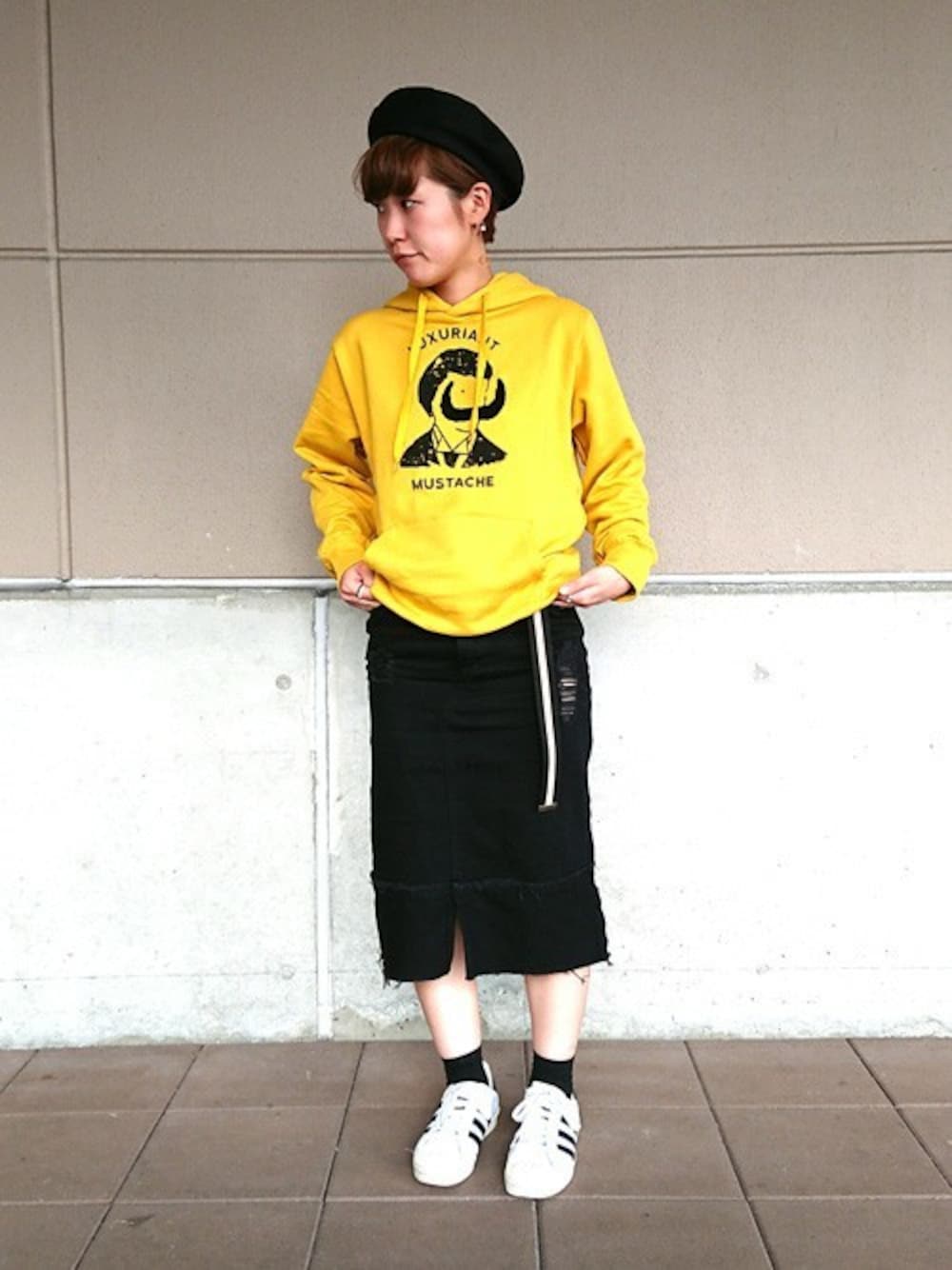 新柄のパーカは落ち着いたイエローで普段暖色を着ない方でも挑戦しやすい1枚です。 「ヒゲ」や「おじさん」のモチーフはグラニフでは度々見かけますが、 こんな立派なヒゲのおじさんは初めてではないでしょうか。 インパクトのあるデザインなので、モノトーンでまとめてスッキリした印象にしました。