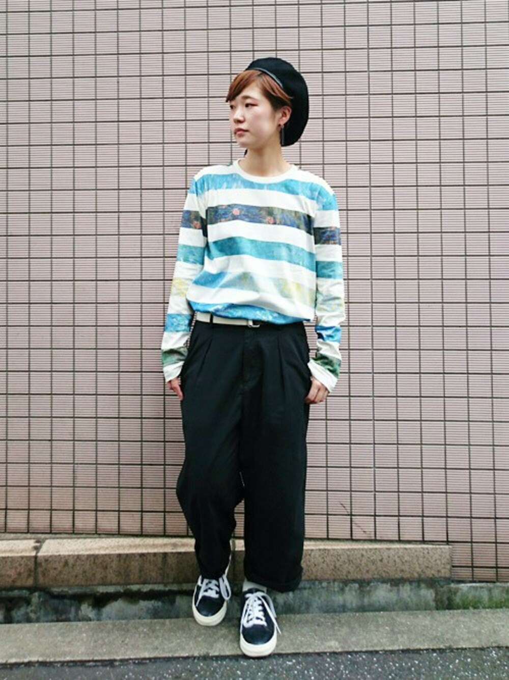 物や風景を写実的では無く、光や色・空気感などを独特のタッチで表現した印象派の絵画。 こちらのロンTはその名作たちをボーダー柄で配置した贅沢な1枚です。 他のアイテムはモノトーンで揃え、デザインのインパクトを引き立てました。 シャツやカーディガンを羽織っても存在感があり、コーディネートの主役になること間違いなしのアイテムです。