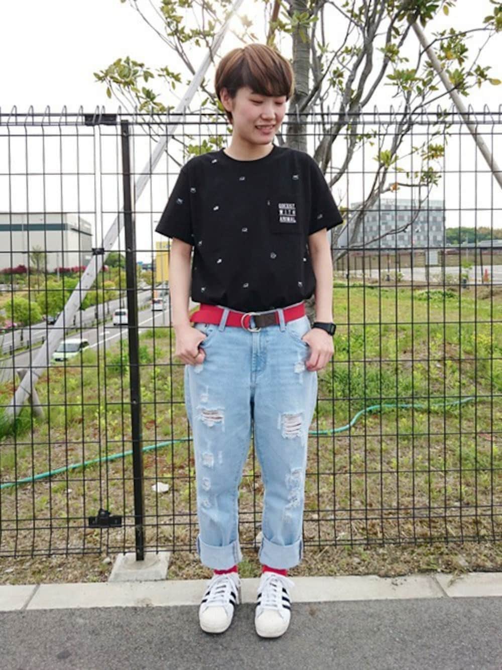 シンプルなタッチの動物が散りばめられたTシャツ。 よくある動物デザインには居そうで居ない、ナマケモノやリス居るのが個人的お気に入りポイントです。 総柄ですがモチーフが大きすぎず、シンプルで合わせ易いバランスのデザインです。 モノトーンで格好良く合わせるのもおすすめですが、今回は淡いデニムに赤のアイテムを差し色にして明るい印象のコーディネートにしてみました。