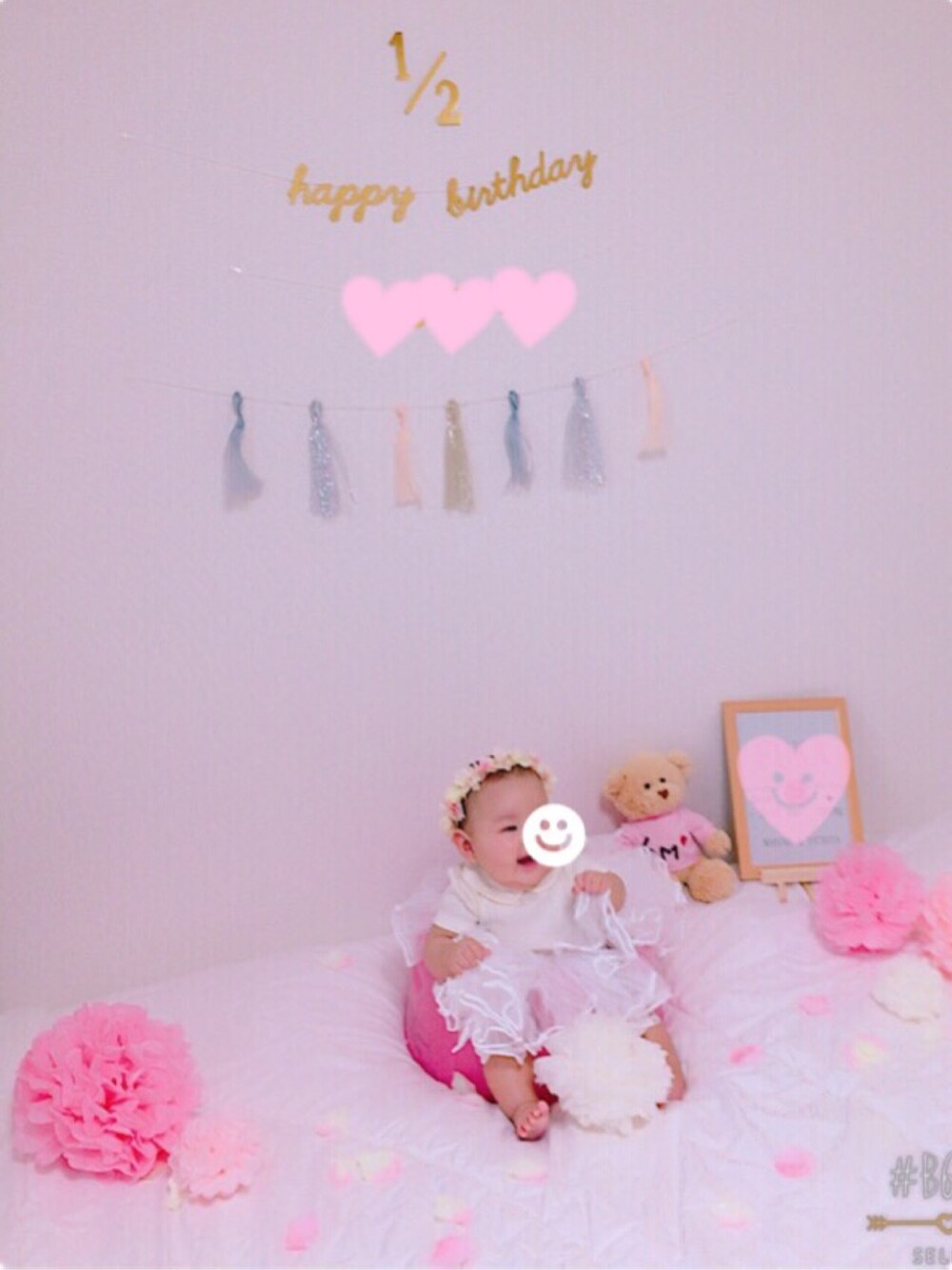 いいねやお気に入り登録ありがとうございます^^ 嬉しいです* 2ヶ月ほど前ですが、ハーフバースデーは自宅で。 装飾*花かんむりはminneやダイソーで購入^^ チュチュは水きりネットで作りました 。 さっそくいじられて手作り感がでてます 。笑 記念に離乳食ケーキも作ってみました^^