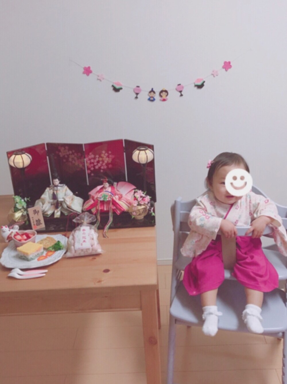 先日のひなまつり 🎎 袴ロンパースはローズ色でお気に入り ☻ 髪飾りとガーランドはminne * 当日はバタバタしてたので娘ごはんだけ菱餅風にしてみました ☻ 見てくださりありがとうございます *
