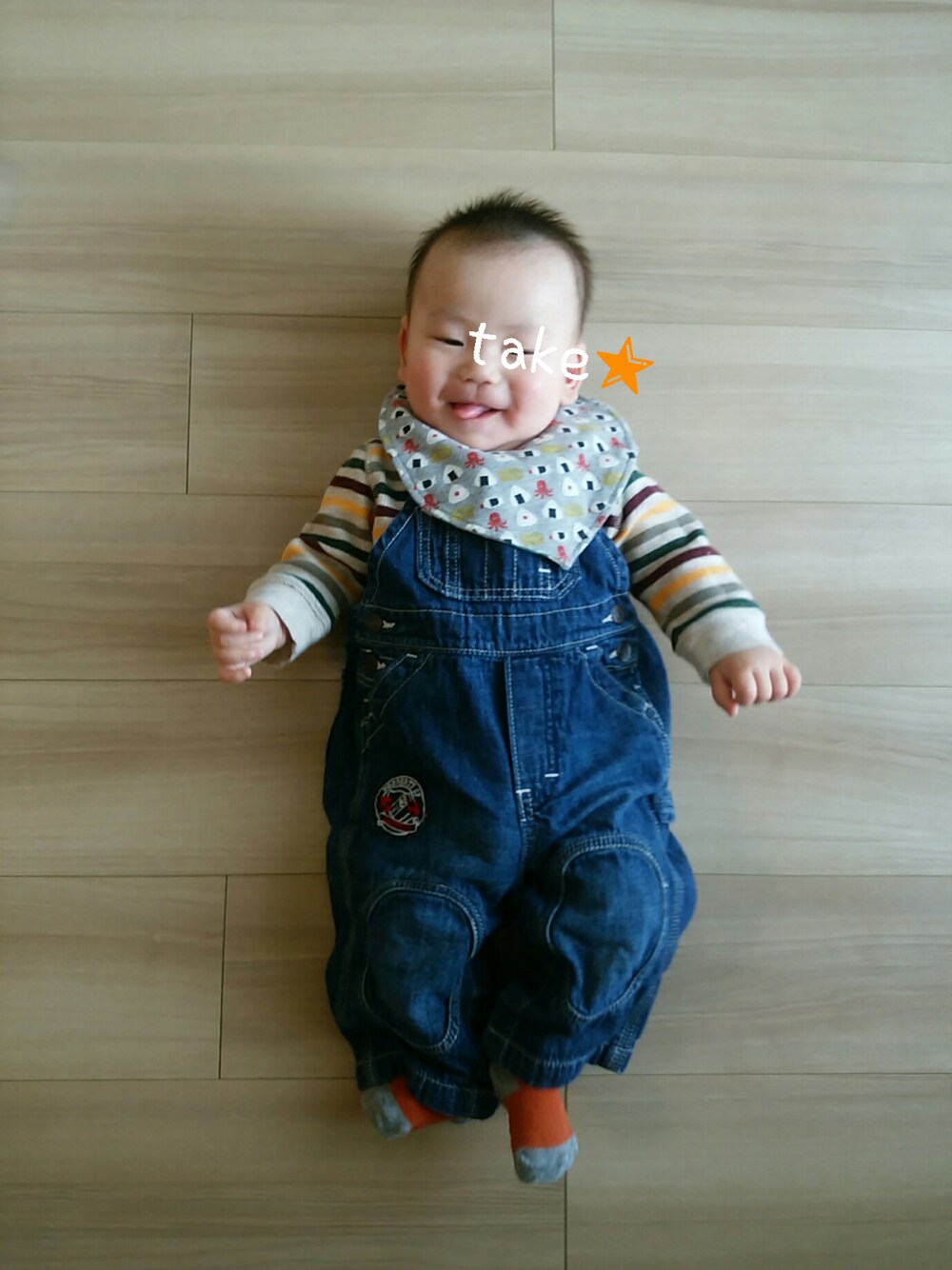 ぺろっと舌を出してごきげん🌟 まだ、4か月だけど、サロペットでキッズコーデ。 出産祝いでもらった、POPなおにぎり柄のスタイは、ボーダーと合わせてみました(*^_^*)