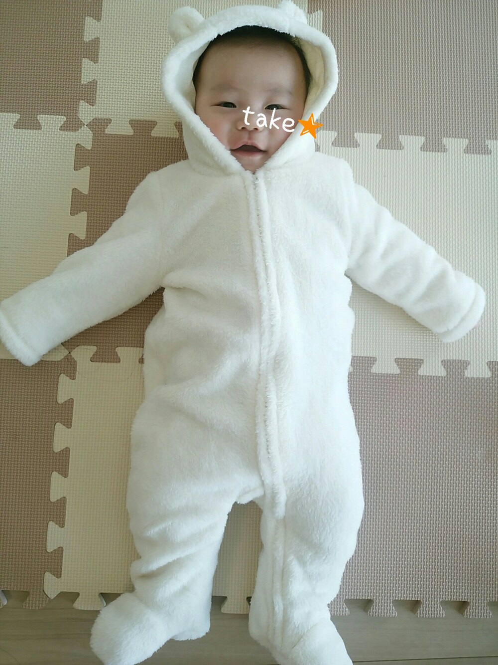 今日はお外が寒そうなため、 出産祝いでもらったシロクマさんでもこもこに。ぬいぐるみファッション♡