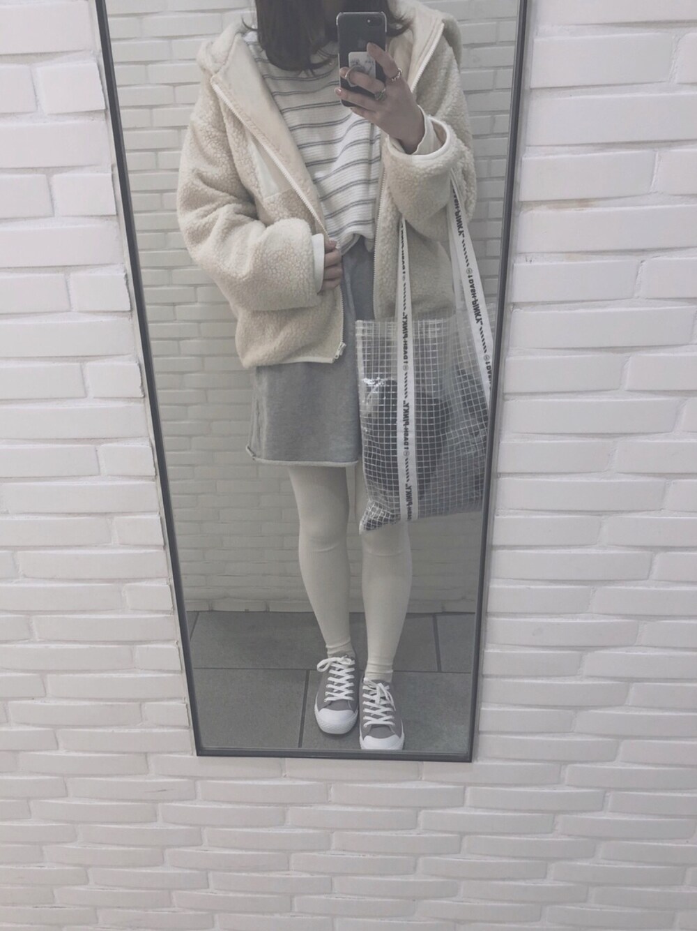 全体的に薄い色でまとめました ボアブルゾンは暖かくて ゆったり着れるのでおススメです! トップスのボーダーのワッフルプルオーバーは古着屋さんで300円ぐらいでした☺︎