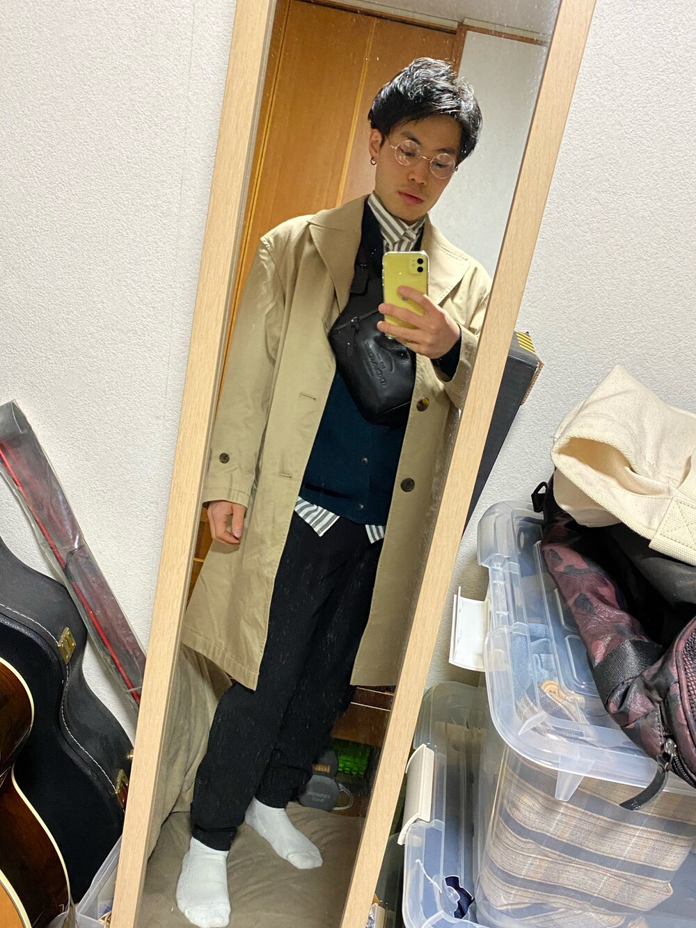 春コーデ🌸その2 ベージュのロングコート 黒のショルダーバック ダテメガネ