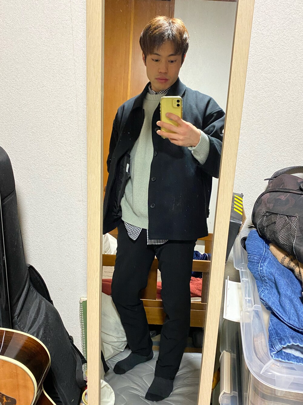 ジュンレッドコーデ 春コーデ ブラックブルゾン ミントグリーンセーター ギンガムチェックシャツ ブラックホワイト ブラックワイドパンツ クラークスゴアテックスシューズブラック