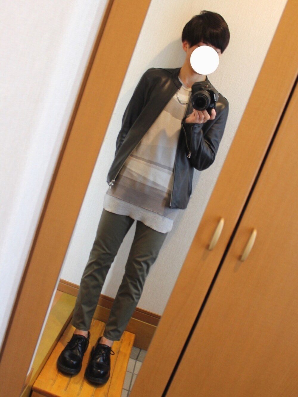 こんにちわ☀ 今日はライダースで大人めコーデ🙆♂️ カーキパンツとグレーニットでシンプルまとめ 春っていきなり暑くなるね(笑)