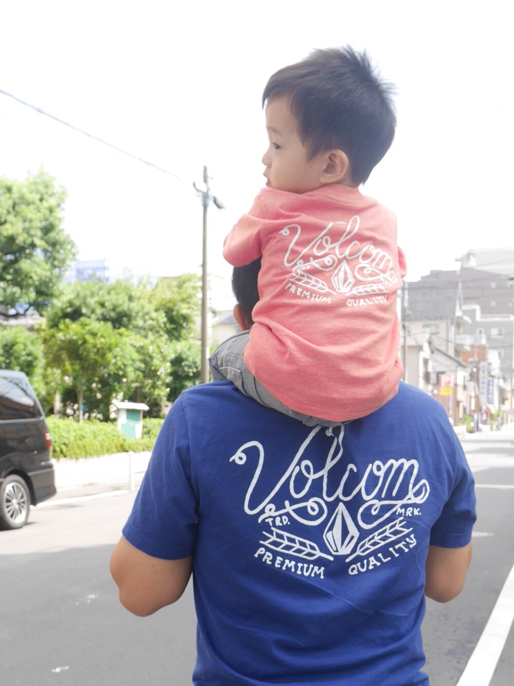 旦那作の切り絵プリントのTシャツ♡ 旦那のお気に入りのボルコムTシャツと同じデザイン😁 これが作りたい!って頑張ってた。笑 Tシャツは西松屋のセールで300円で買ったもの。 パンツもグレーのデニムでリンクしたよ😉💓 旦那はボルコム信者でほぼボルコム😂