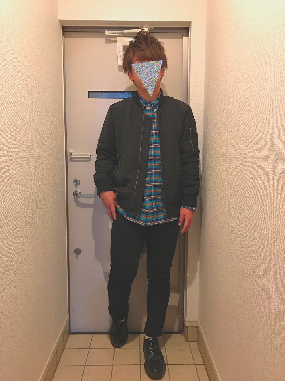 日曜日のコーデ🤘🏻 この日は夜から出かけて寒かったので、今年初のMA-1を着用しました!! 中は色の映えるチェックのシャツを着て、それ以外はキレイ目を集めて中和?させてみました🤔🤔