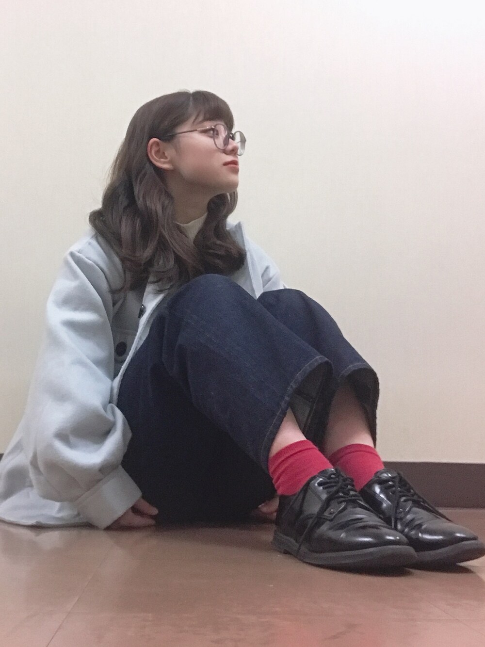 白×青×赤のコーデ☺︎ 全体的に青のグラデーションでまとめて 靴下を赤にしてポイントにしました🧦