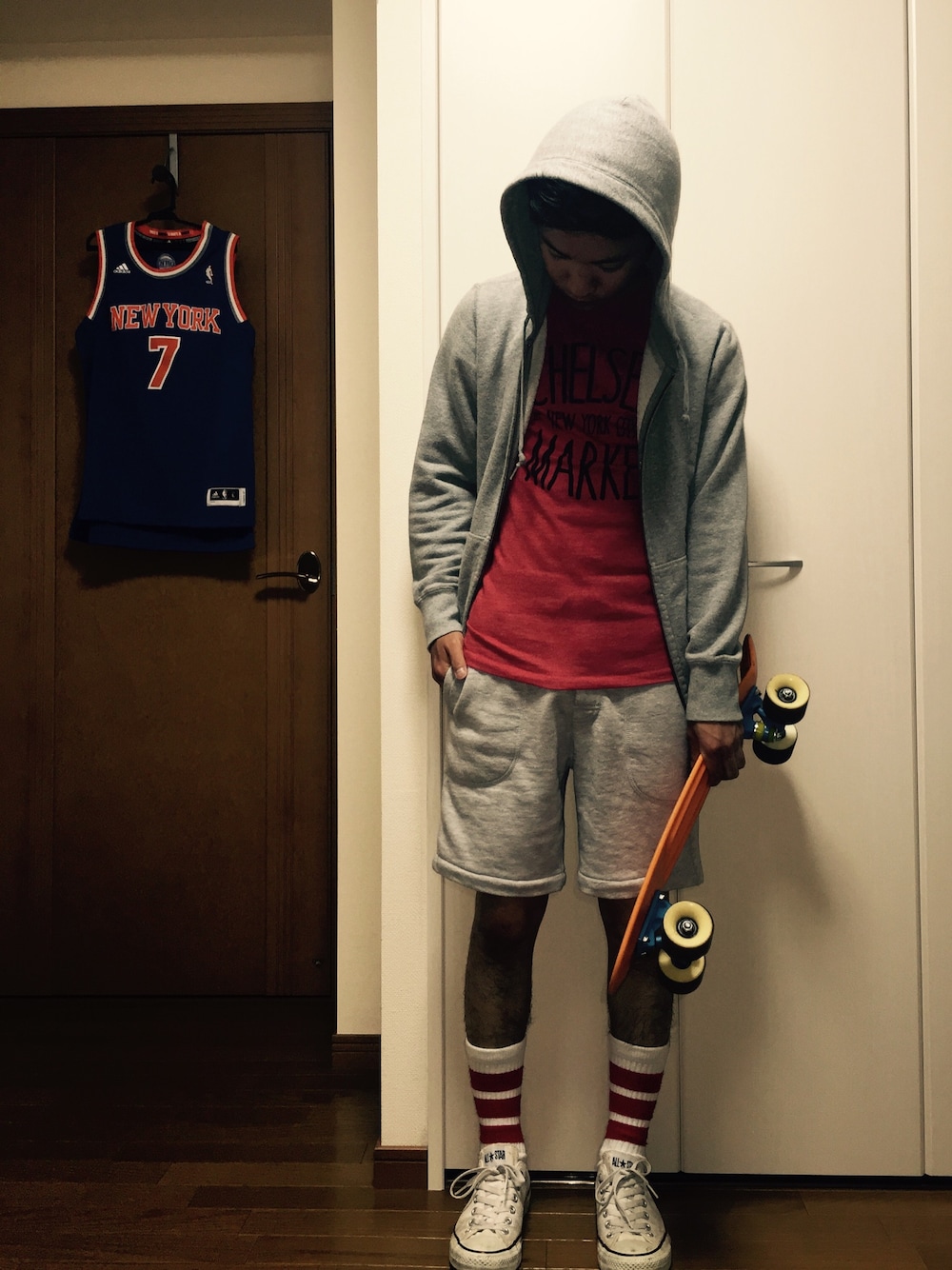 アメリカのスケボー少年をテーマに。 Tシャツはニューヨークのチェルシーマーケットで見つけました。 お店のキレイな金髪お姉さんと「サイズどれがいいかなあ?」 「あなたなら、SかXSじゃないかしら。あなたすごく細いし」とかお喋りしたのもいい思い出です。 アドレス聞いておけばよかった…