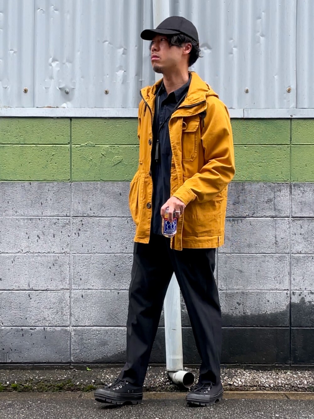 なんかオシャレな人達って謎のオシャレな店のコーヒー片手に写真撮ってる人多いなー でもオッサンの僕にはスタバですら注文方法よく分からない せや!いつも飲んでる物を等身大ありのままで撮ったろ!の精神 アウターのイエローが強烈なので他の色味を抑えることでカラーを引き立てています シャツやスラックス等でラフになり過ぎないようにバランスを取りました というのはタテマエで 酒飲んでからラーメン屋に行こうと思い、汁をひっかけても汚れが目立たないダークトーンの服を着る作戦です 案の定、腹部に汁ひっかけました