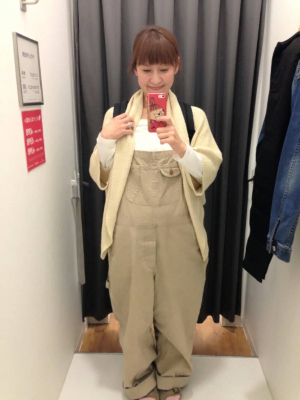 このカーディガンは上に着ると短く下に着ると長く丈が変わるのです! サロペットはブカブカです(´・Д・)」