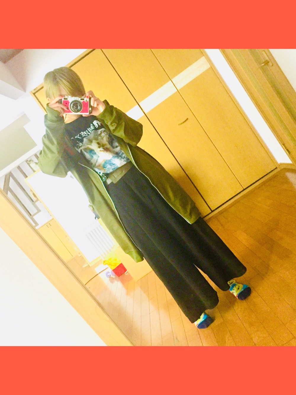 みにぃむぅの世界制波Tシャツ(XL)をワイドパンツにINしてベルトでダボダボしないようにしてみました( *´艸`) FUNKY FRUITのカーキのセーラーパーカーこれからの時期にとてもいい☺️ フォロバするのでじゃんじゃんフォローして下さい(´˘`*)