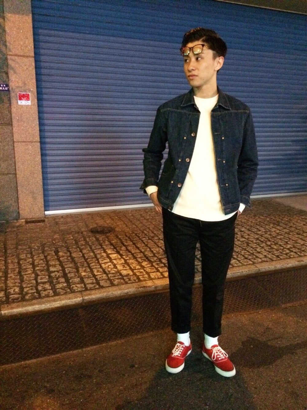 メガネ:不明 デニムジャケット:BRU NA BOINNE サーマル:Nigel Cabourn パンツ:The FRANKLIN TAILORED スニーカー:US Keds インナーに着ている大きいガーゼがポイントです。