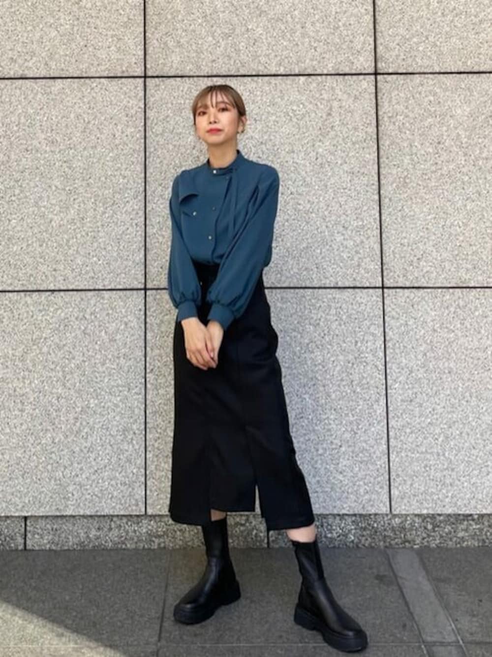 しっかりした素材のブラウスは着心地抜群です!袖のバルーンシルエットで着痩せ効果あり。 カラーが苦手な方でも取り入れやすいブルーです。 綺麗めになりがちなスタイリングなのでブーツでカジュアルダウンしました。