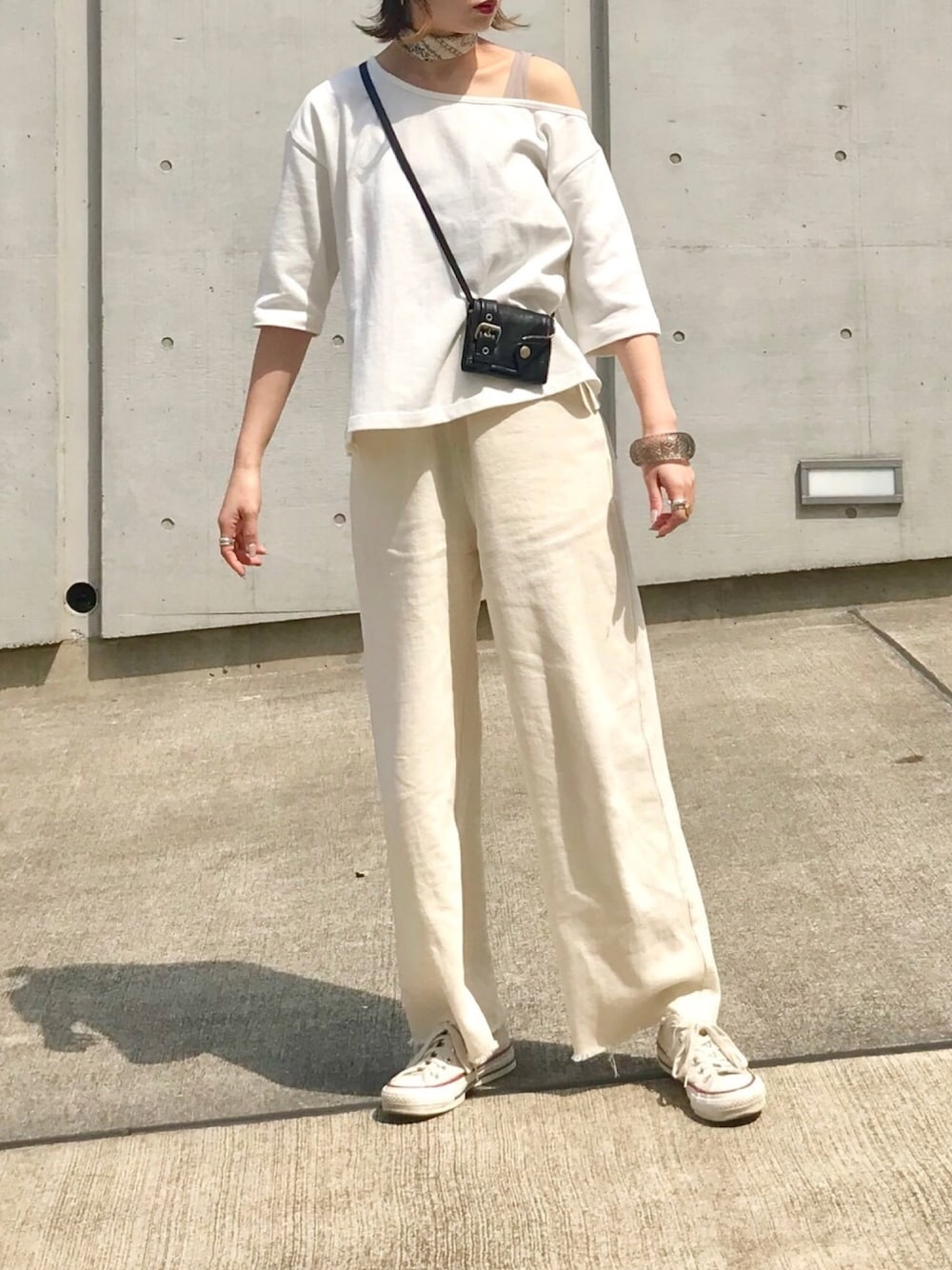 トレンドのワンショルダートップスに ゆるパンツ★ 定番カジュアルよりも、 抜け感のある雰囲気になります。 柄スカーフを巻いて 今年らしく( ◠‿◠ ) トップスはクーポン商品☺︎