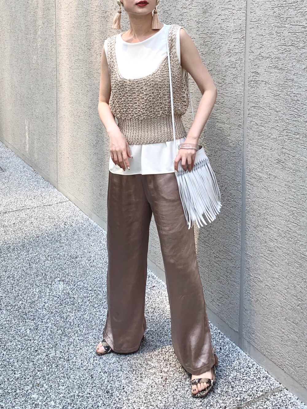 ノースリーブ ✖︎リネンベスト☺︎ ゆるりとサテンパンツを 合わせました★ 新しい 真っ白なフリンジバッグは これからの季節にぴったり✨ タッセルピアス、クリアバングルを 合わせて夏らしい雰囲気に☺︎ Instagram ↓ ing.cream