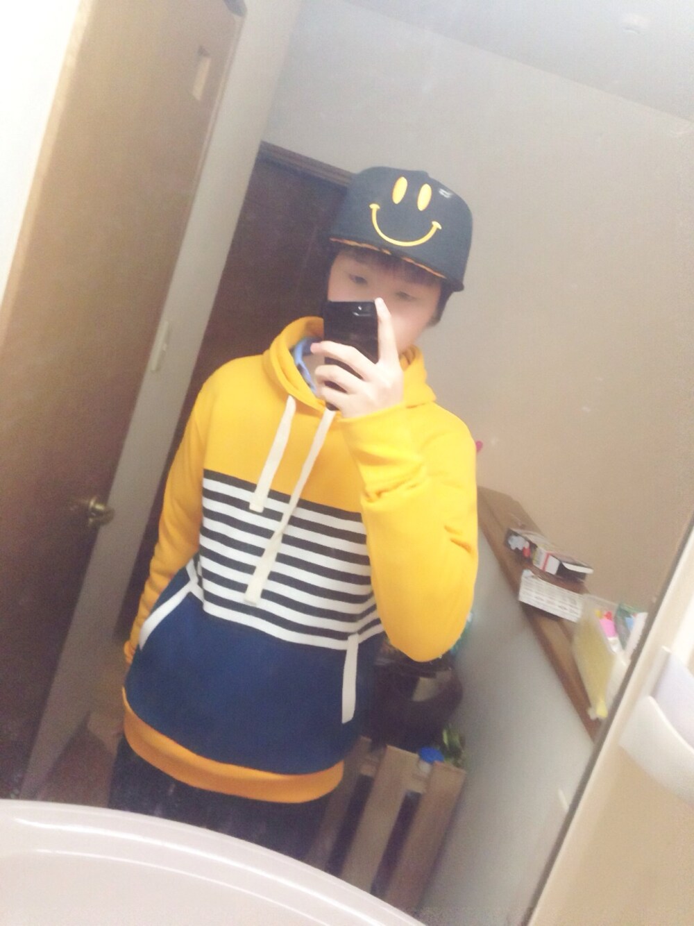 今回帽子はスマイル君で黄色にボーダーが入っているパーカーなので、少し子供っぽくヾ(@⌒ー⌒@)ノ 春まで着れるコーデですね(≧∇≦)