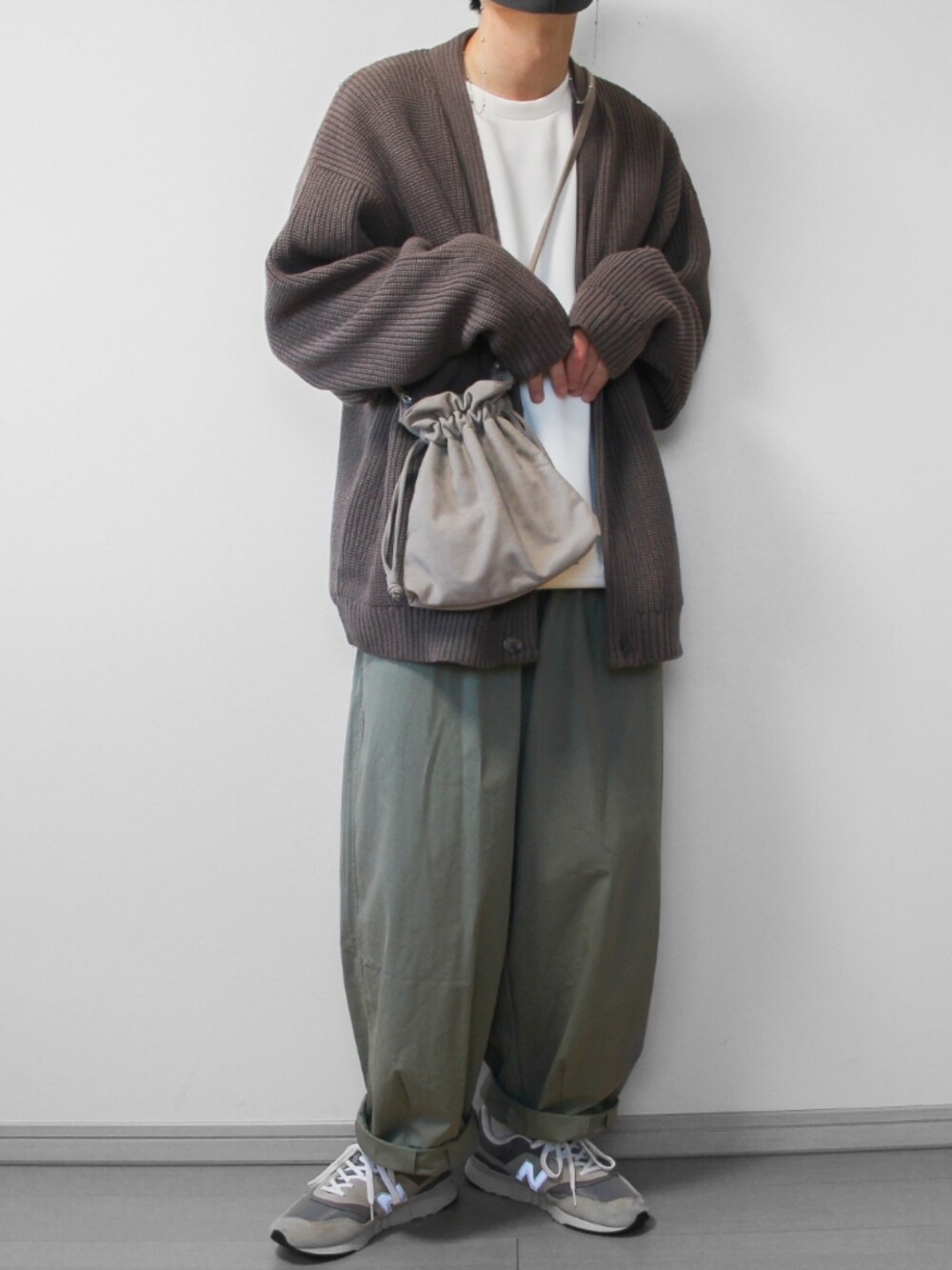 モカブラウン×ホワイト×カーキ アースカラーの野暮ったさを白を使って緩和させたスタイリング。小物の色で全体のバランスを取る。 ➠Manhattan Square Garden 畔編みルーズシルエットカーディガン ¥3,960|Mocha Braun|Lsize ➠GU ダブルフェイスビッグプルオーバー ¥1,990|White|XLsize ➠Libra Cue サーカスパンツ ¥3,960|Khaki|2 ➠Instagram @kei__wear