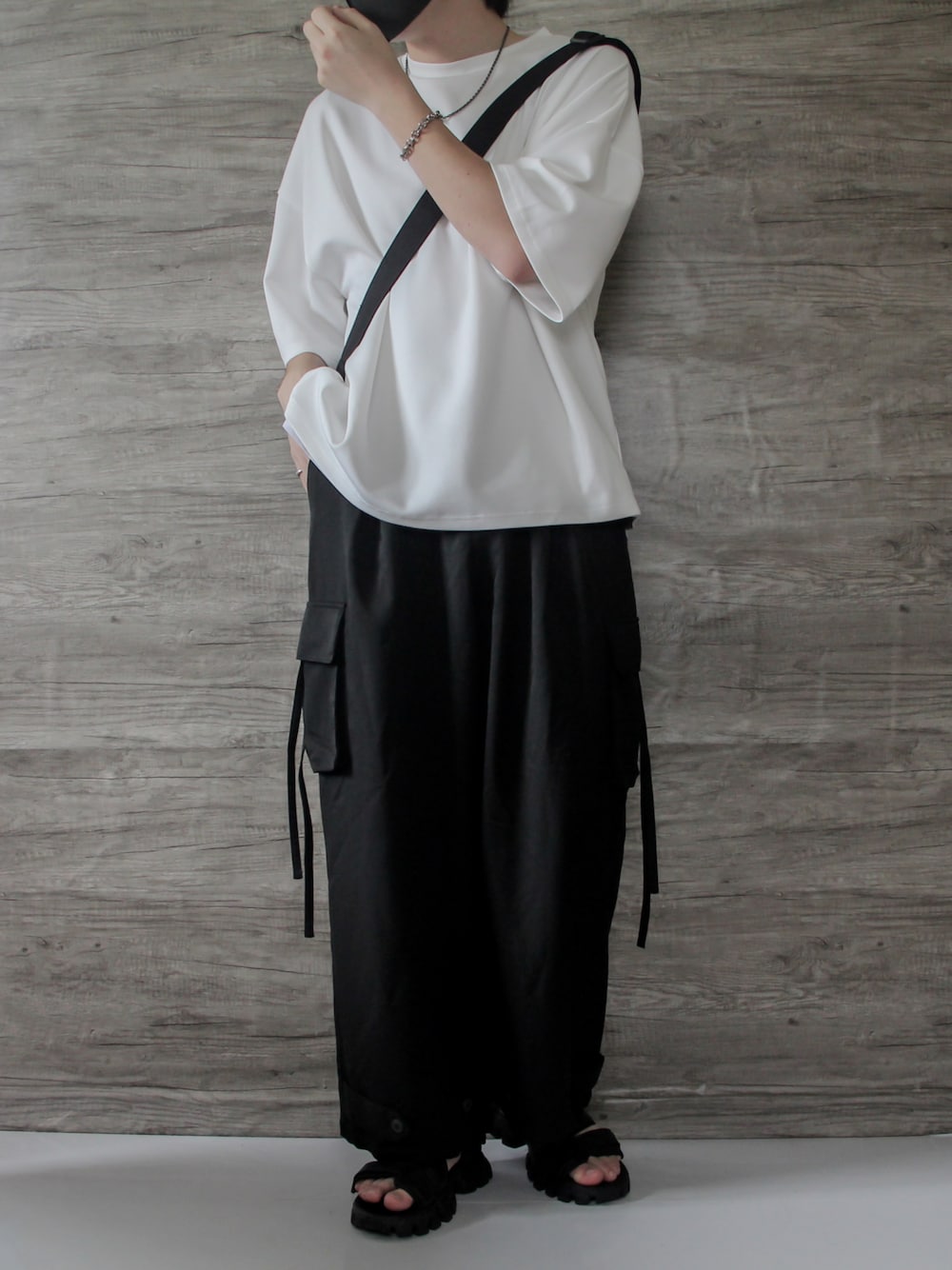 White × Black. 学生でも真似しやすいモノトーンコーデ🤍🖤 シンプルな白Tでも止血紐が垂れた癖のあるカーゴパンツを合わせるだけでコーデの表情が変わるのが魅力的。 シルバーアクセサリーをプラスしてあげるとより細部まで気を使っていてオシャレ✨ Instagram:@kei__wear .