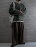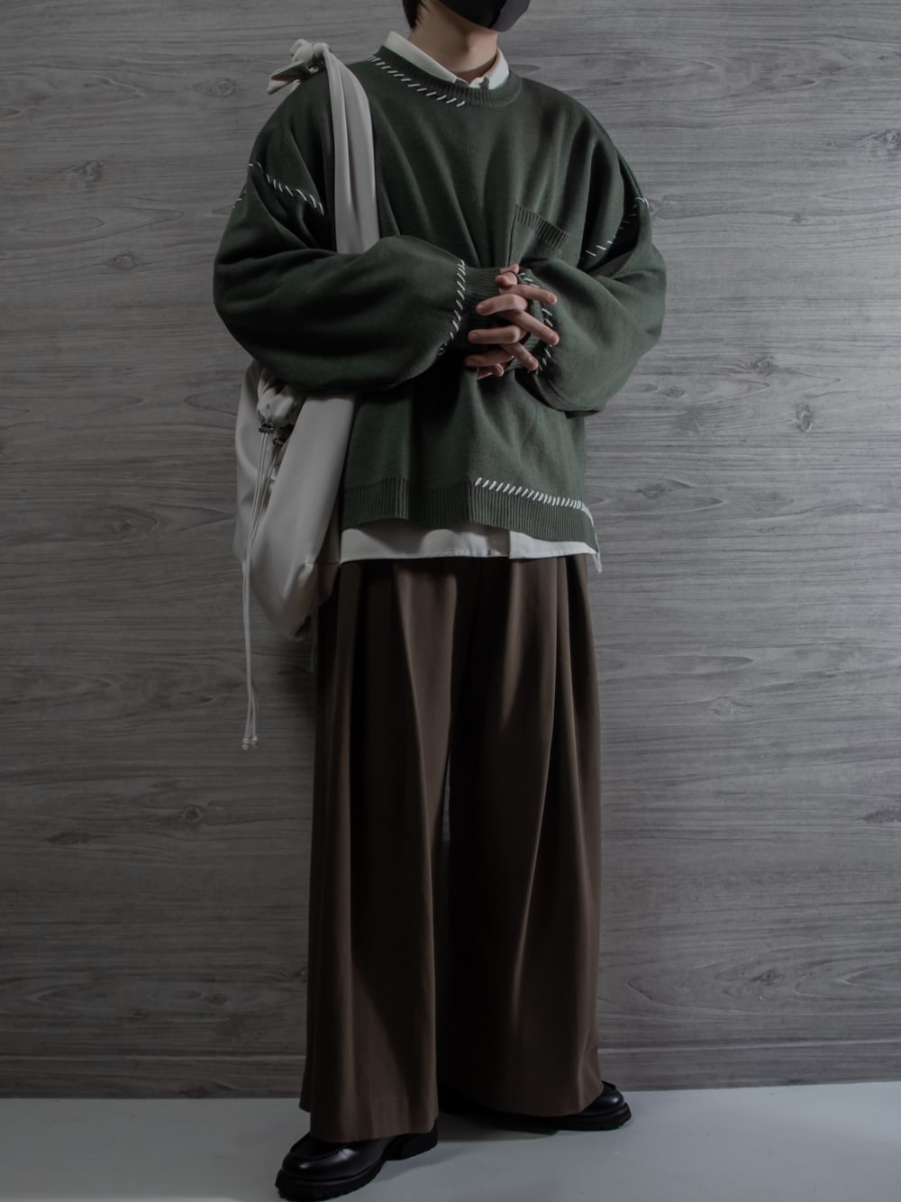 Green × Brown × Natural. ステッチニットを使ったゆるコーデ🦖🤎 アシンメトリーに縫われたステッチが特徴の可愛らしいニットに対して深めのタックが入ったスラックスを合わせてバランスを。 Instagram:@kei__wear .