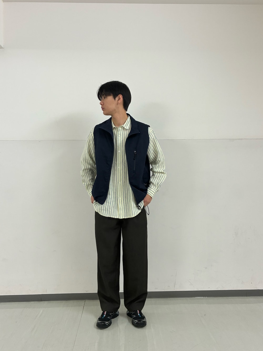 清涼感のあるフレンチリネンシャツを主役に、ネイビーのテックベストでギア感をプラスした都会的なスタイルにしました。リネンの柔らかな質感と、テック素材のコントラストがポイントです。 ボトムスには、さらりとした肌触りのセミワイドパンツを選びました。全体をダークトーンのパンツで引き締めることで、トップスのストライプ柄を際立たせています。足元はスニーカーで軽快にまとめ、春夏の街歩きにぴったりなアクティブな装いに仕上げました。
