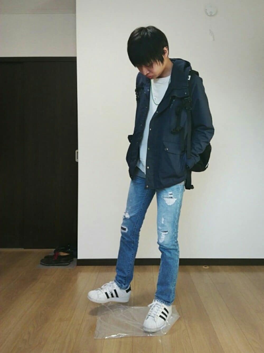 lounge lizardのマウンテンパーカーでカジュアルコーデ🙆 パンツはクラッシュデニムにしました(* ̄∇ ̄)ノ save、コメント、followなど宜しくお願いします(^-^ゞ