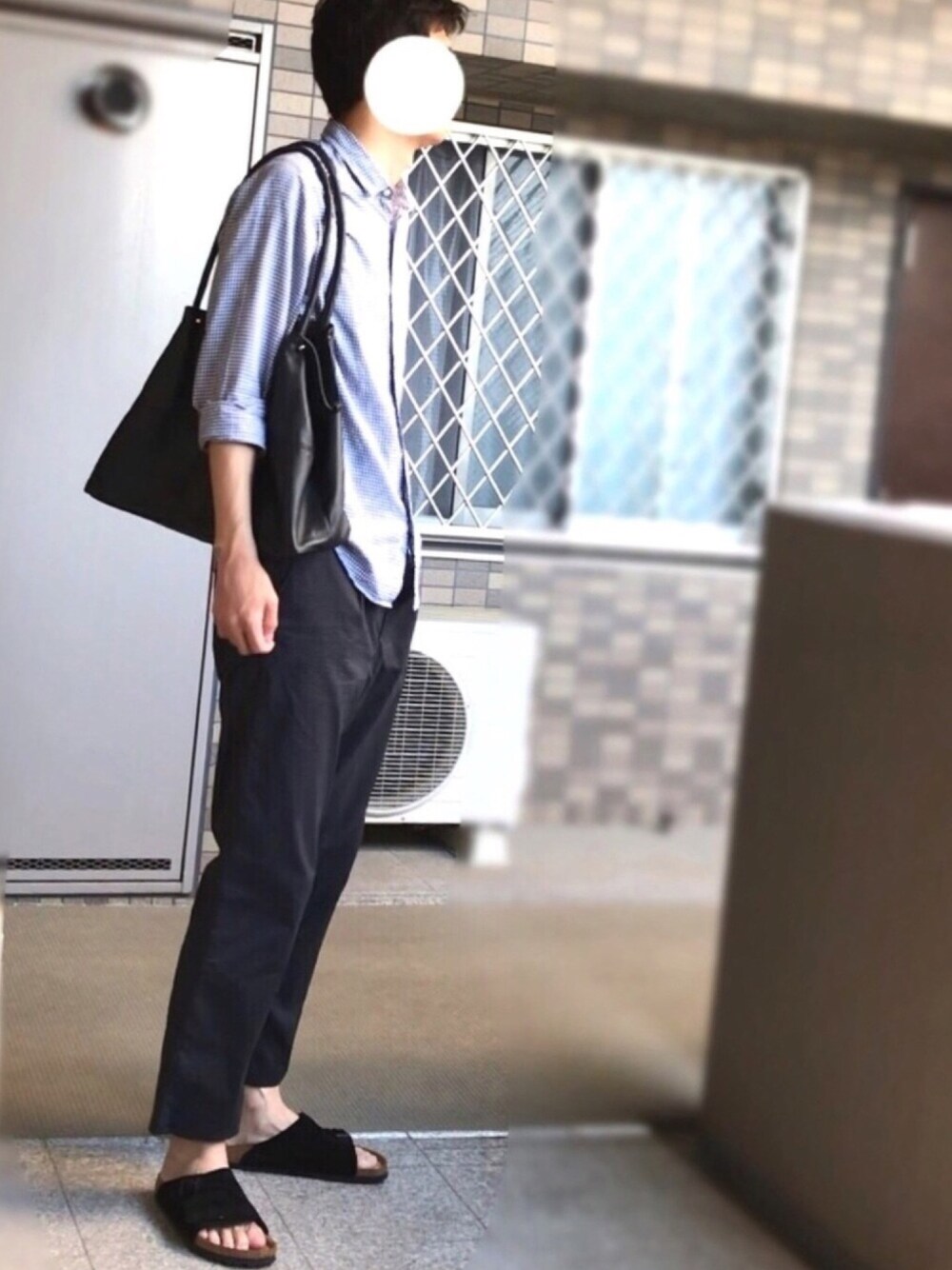 ギンガムチェック と 黒のイージーパンツ 。 カジュアル過ぎない感じに。 D0715 3725