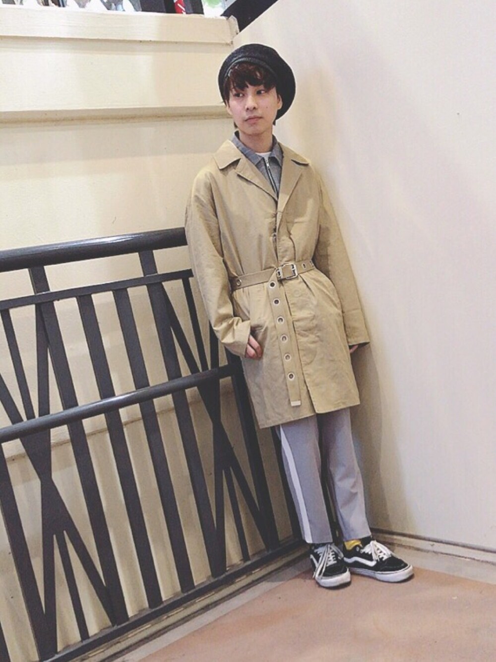 オーバーコートにチェックのスウィングトップを重ねて、 ベージュ×グレーコーデ🏁 ベージュやグレーを取り入れると、春っぽいカラーになりますね🍀