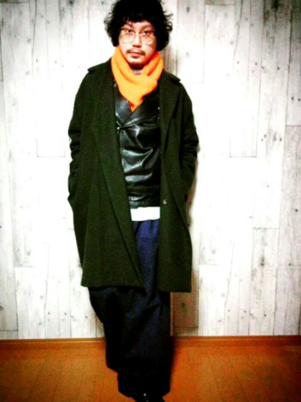 こんばんは!ケンゴです! いつもお気に入り、いいねを下さる皆様感謝です(*´∀`) さて、今回はライダースをインナーにしたくてこんな感じにまとめてみました。 全体的にシルエットを大事にしてます。 靴下で有名なRoToToからストールがでてましたのでコーデのワンポイント取り入れました。 絶妙なオレンジ色がグリーンのコートと相性抜群!