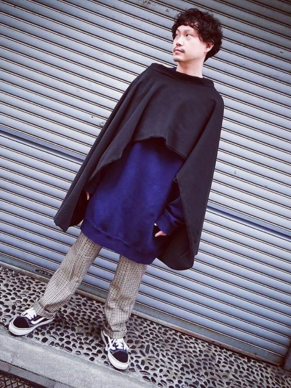 オーバーサイズのスウェットにポンチョのゆるゆるコーデ。 母からドラクエⅤの主人公かヨシヒコみたいって言われたw w