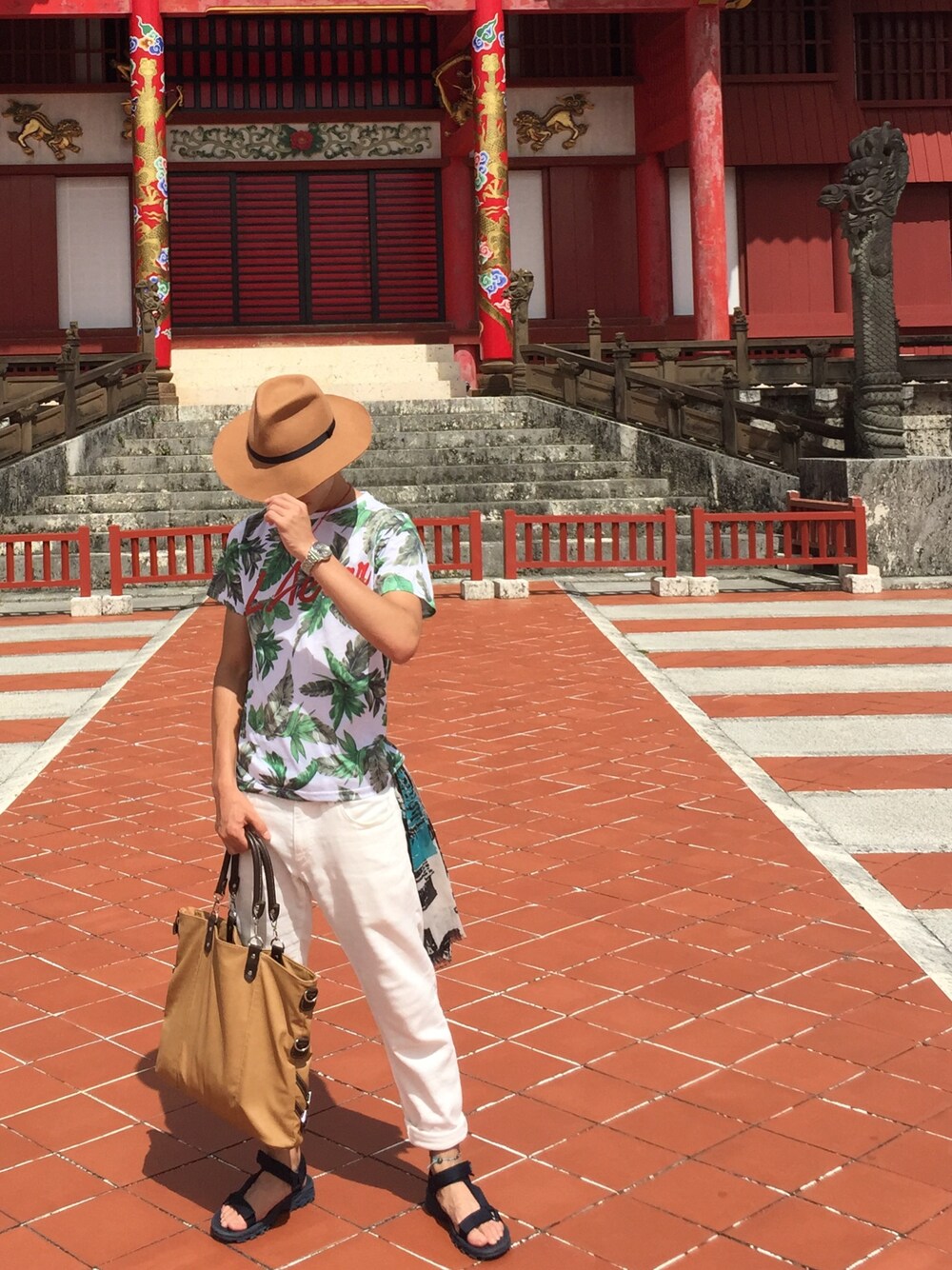 こんにちわ✋ 夏の思い出、 沖縄旅行1日目です😁 今回は、沖縄ということで勝手なイメージなんですが、 沖縄=アロハ ていうイメージがあったんで、 アロハTを初めて着ました😁✨ 自分が見慣れなくて困ってます(笑) バックに、世界遺産の首里城と撮っちゃいました😎📷 アロハの着方があまり分からなかったので、 白パンロールアップに、夏感出すために、明るいハット+サンダルで、決めてます😁 腰回りにチャームポイントとして、垂らしてみました✌🏻️ それでは、沖縄楽しみます! なんくるなさいあ〜(*^_^*)