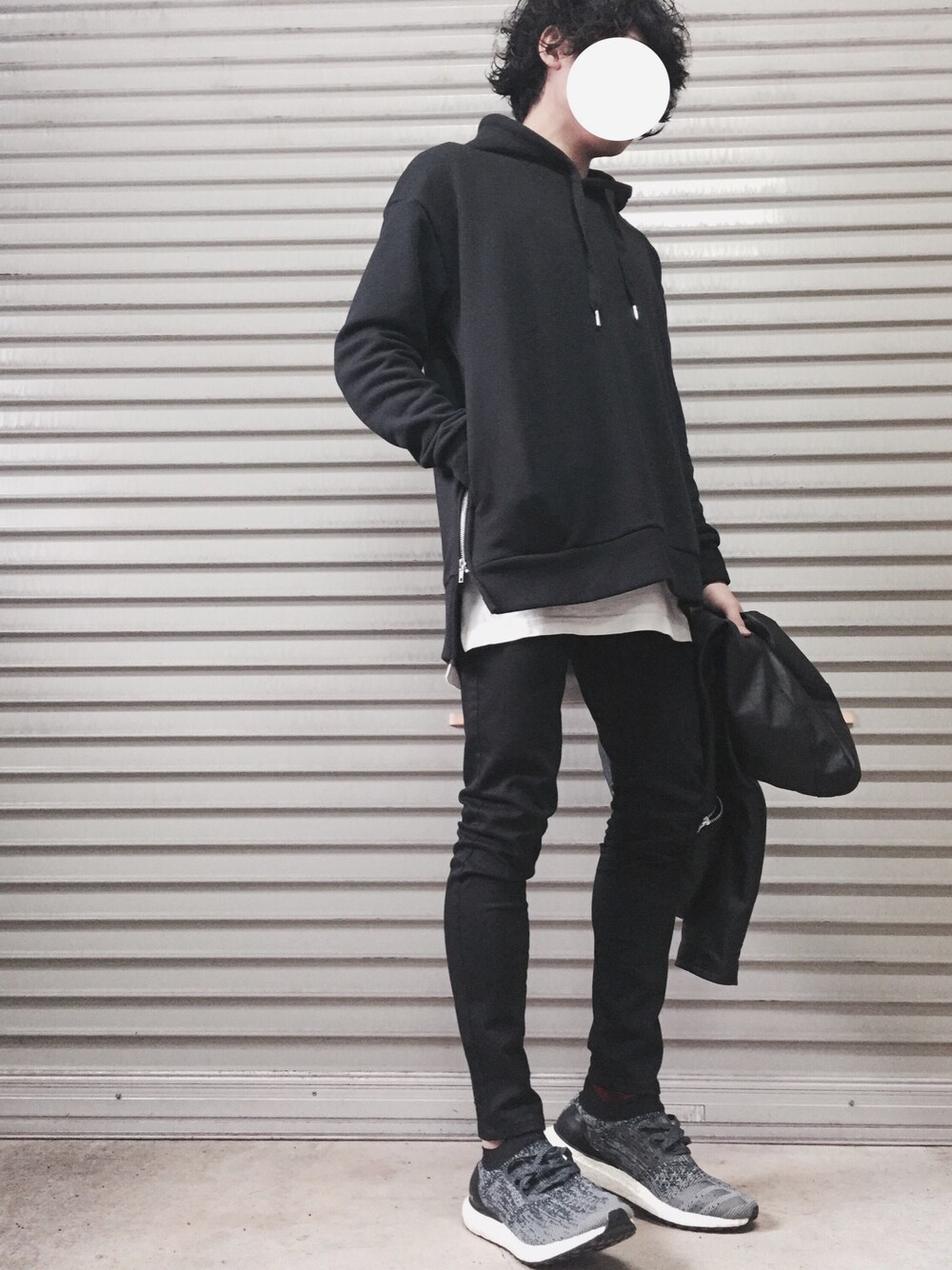 黒コーデ パーカーのサイズ感とジップがいい感じ 新しいウルトラブースト欲しいなぁ では🖐