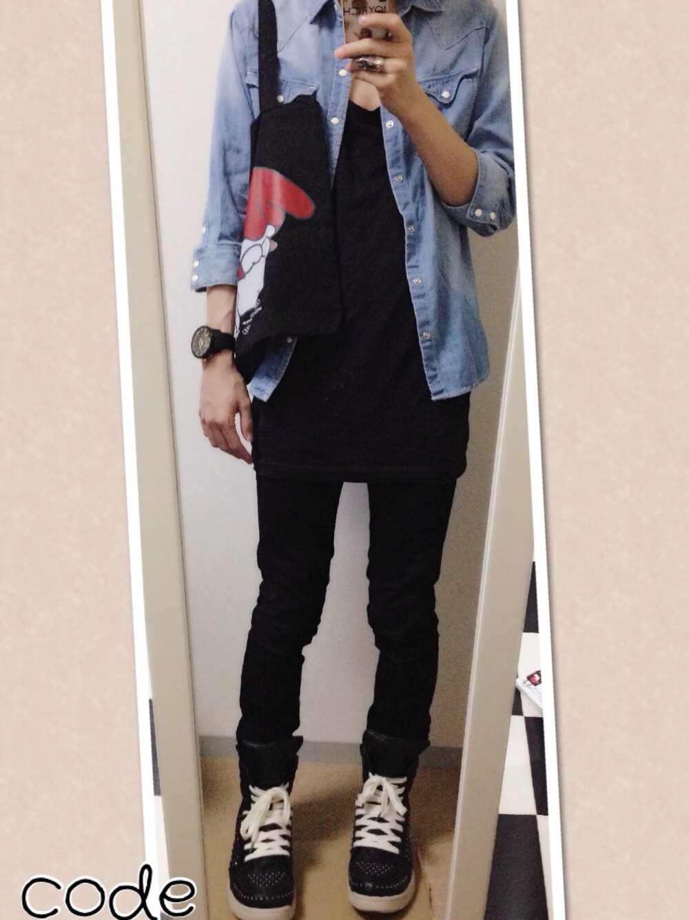 春っぽいコーデ。 シンプルな服装にボリュームのあるスニーカーと時計をアクセントにしました。 アンダーカバイズム×マイメロのトートバッグも取り入れてみました笑