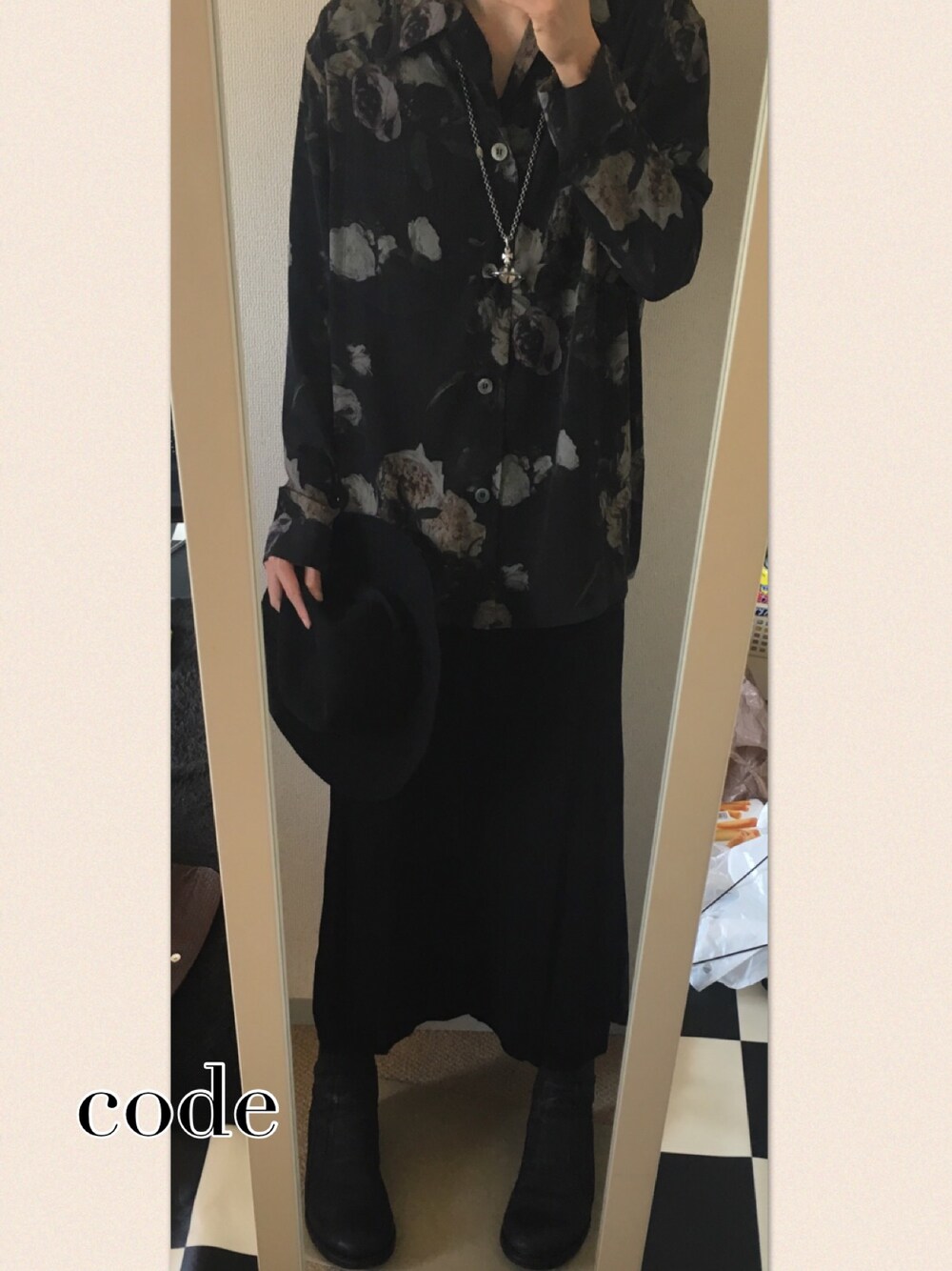 春先取りコーデ ダークトーン×花柄がポイントです。