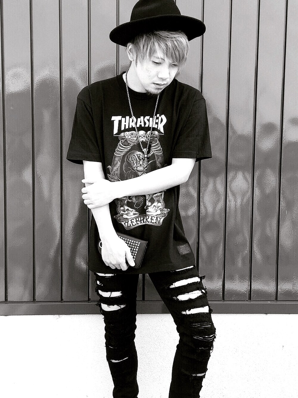 ROCK×モードスタイル。 細身のクラッシュデニムにオーバーサイズのTシャツ。 好き嫌いがわかれそう!!笑