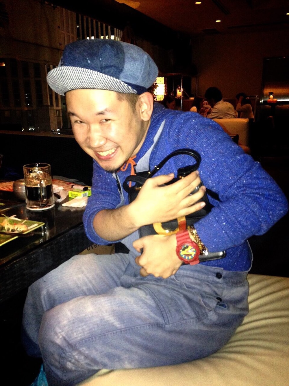 カバン強奪の図。 飲まない奴のカバンは返しません。笑 帽子はmagnolia別注のデニムワークキャップ。 バイザーあげちゃう仕様! いちおしでやんす。