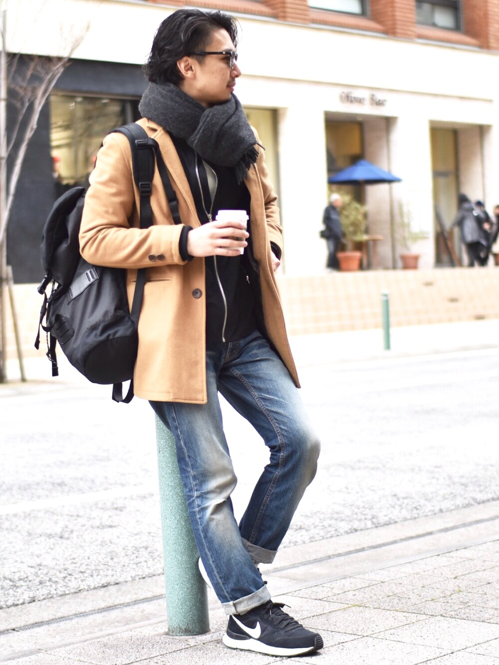 キャメルのチェスターとUSEDデニムの王道コーデです。 MA-1をインナーに入れて、今っぽいスタイルにしました。