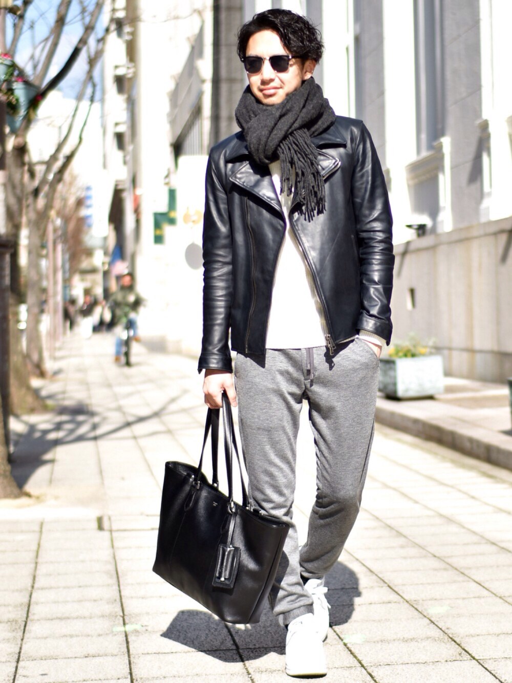 ジョガーパンツとライダースを合わせて、抜け感を出したレザースタイルです。