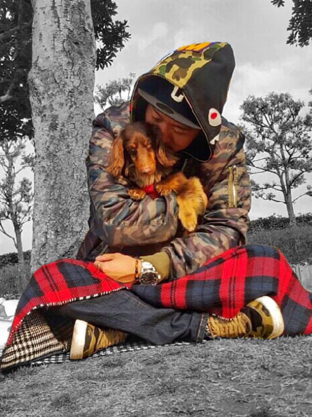 愛犬と散歩 冬の公園 迷彩 MA-1 BAPE APE シャークパーカー BAPESTA NIXON