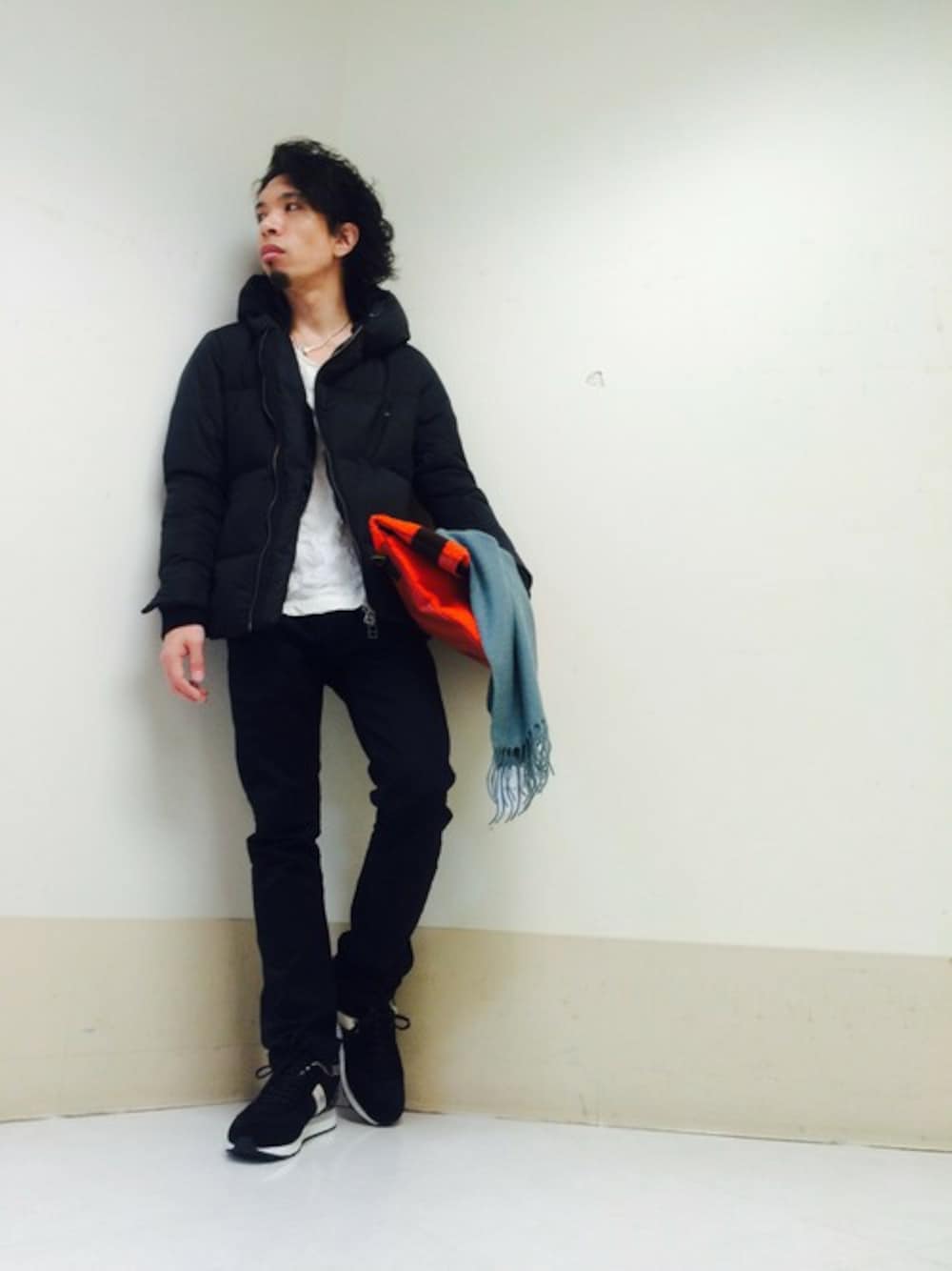 ビッグフードのナイロン系のスポーティなダウンジャケットとスニーカーを、オールブラックでクールな印象に! クラッチバッグとマフラーでさりげなくクリスマスを意識♪